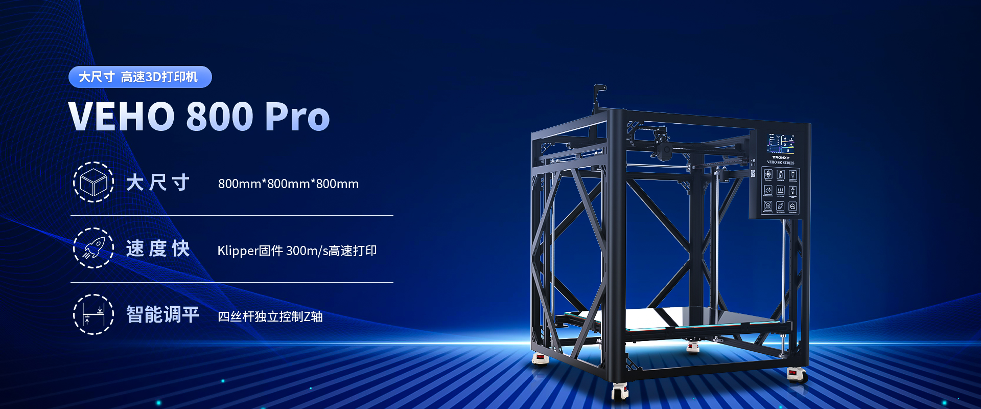 自主設計,定制生產線,可生產從桌面級到工業級等 尺寸從180mm到1.6米3D打印機